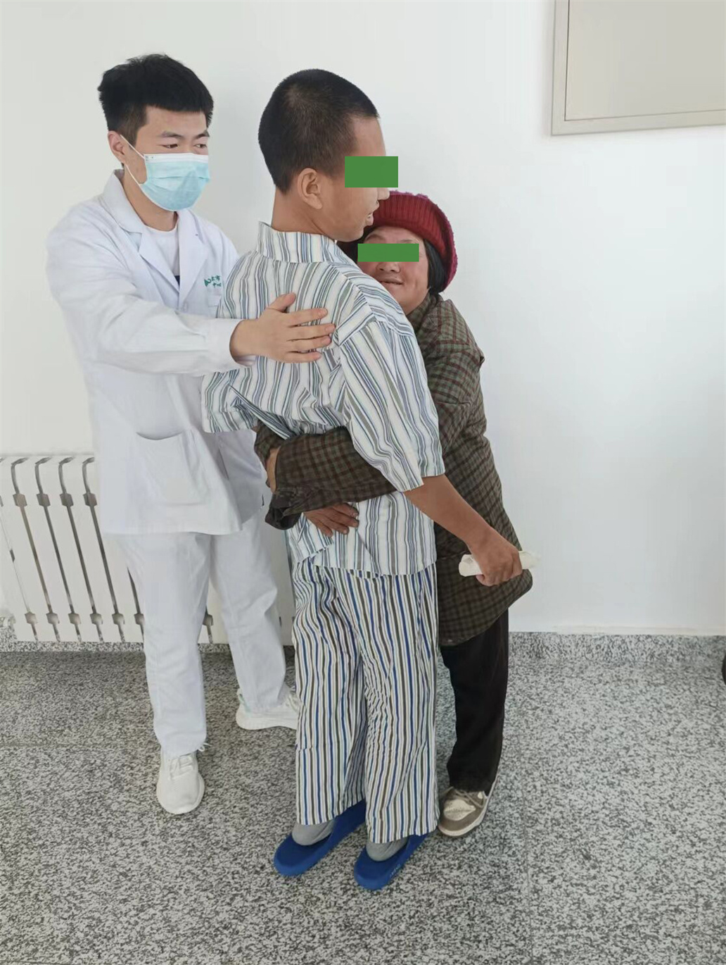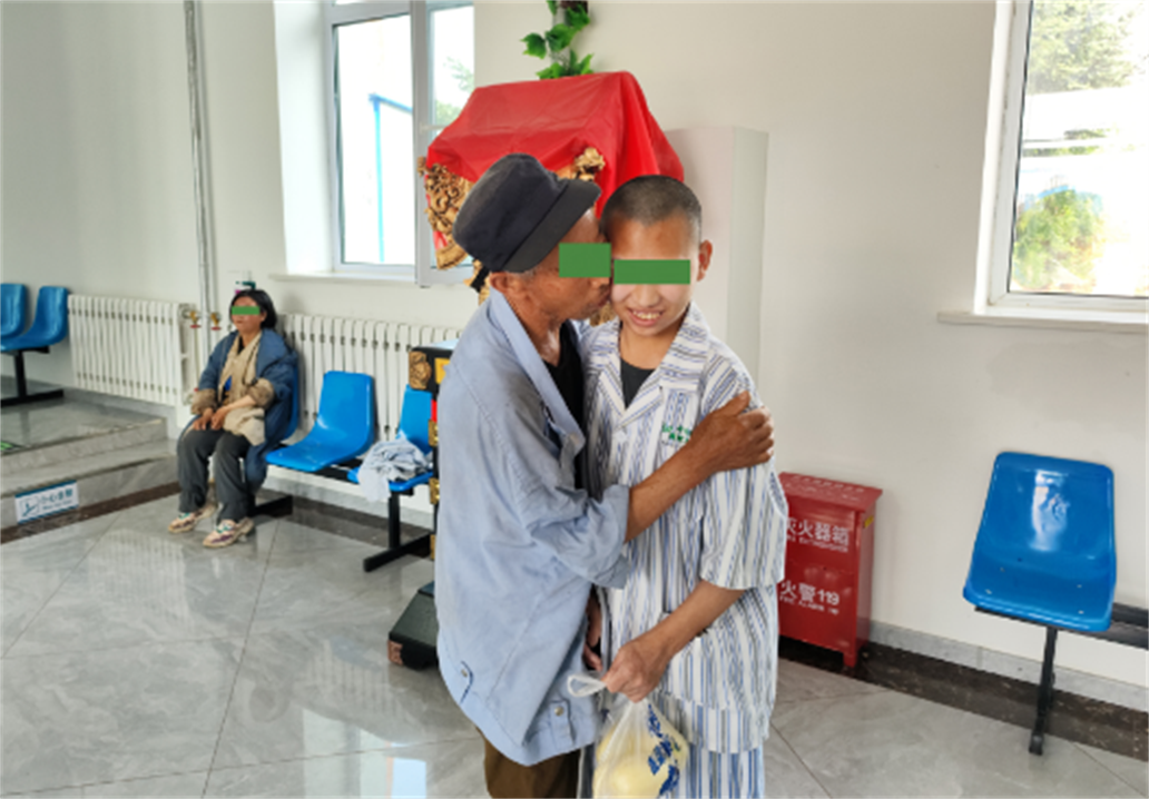 2023年初,呼伦贝尔市第三人民医院组织医务人员下乡义诊,当地政府通过义诊活动得知住院相关优惠政策,为了解决刘天一家的实际问题,在政府人员的帮助下,刘天(化名)来到了呼伦贝尔市第三人民医院莫力达瓦达斡尔族自治旗院区接受系统、全面的治疗。由于家庭贫困无力支付住院费用,政府及医院都给予了相应的减免政策。经过一段时间的专业诊治以及悉心护理,刘天(化名)的身体及心理状况发生了翻天覆地的转变,精神状态得到了很大的改善,也可以与人进行简单地交流了,手脚的冻疮早已治愈,脸上充满了灿烂的笑容,父母来探视时看着儿子的状态逐渐恢复正常,连声感谢医护人员的细心呵护,流下了激动了泪水。刘天(化名)见到父母后显得很高兴,一边挠着头,一边笑着……