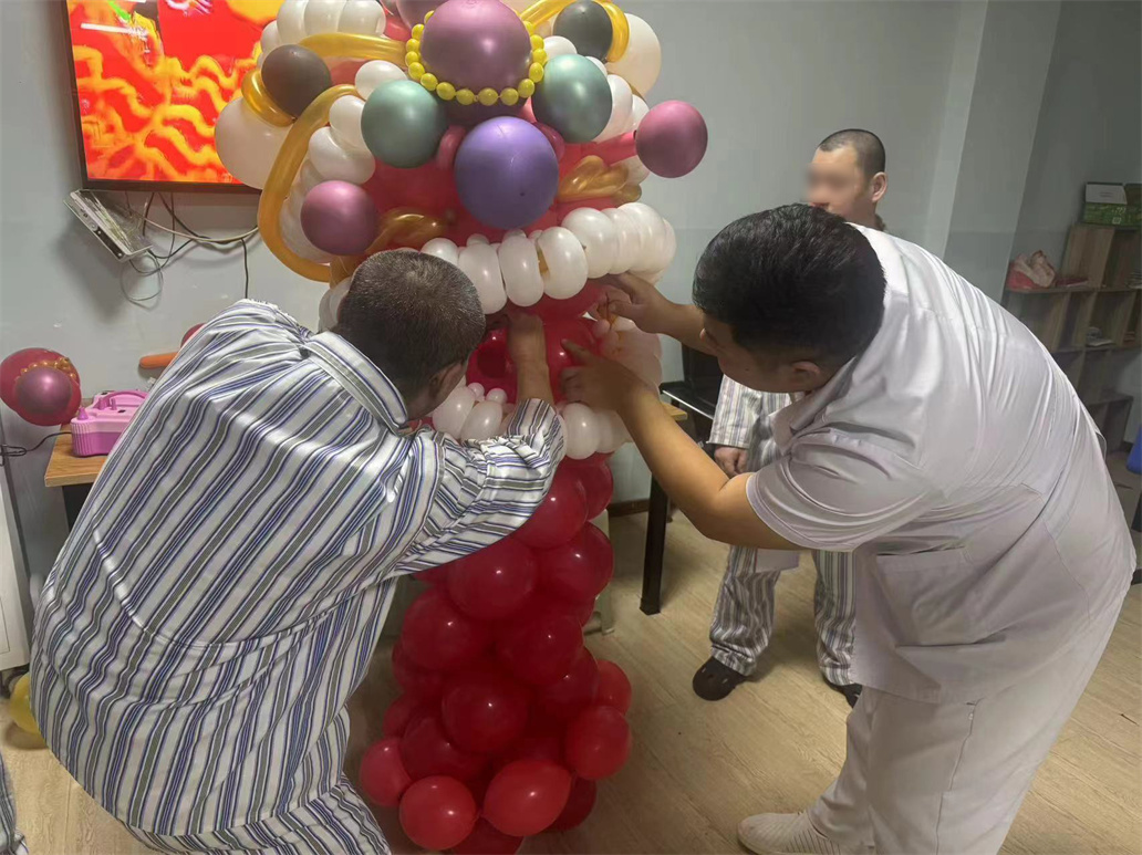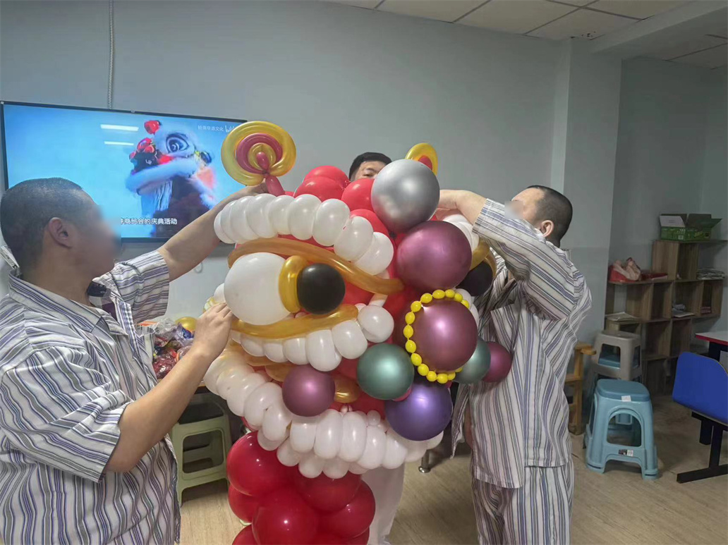 科室护士为患者朋友们讲解醒狮文化的历史渊源,为其播放了各种舞狮表演的视频,通过陪同患者一起探寻这一传统艺术背后的故事和寓意,感受这份文化的独特魅力,随后患者们通过气球大小的选择、颜色的搭配、吹气球、拧气球以及花样设计等,在手工制作过程中他们相互鼓励,互相分享,欢声不断,他们不急不躁,非常有耐心的完成每一个步骤,此次制作不仅锻炼的患者手指的灵活性和想象力,日常生活技能也得到了极大的锻炼,经过一番努力,最后护患共同创作出了非常优秀的作品。
